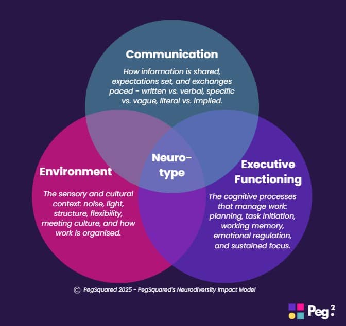 about 2 months ago • 6 min readPegSquared Weekly PegSquared's Neurodiversity Impact Model: communication, environment, executive function Pegsquared's Neurodiversity Impact Model illustrates how neurodiversity manifests at work across three interconnected domains: Communication, Environment, and Executive Functioning, with individual neurotype at their convergence Dear Reader, I spent this week building out a comprehensive neurodiversity awareness session for a client, and I kept coming back to one uncomfortable truth:...